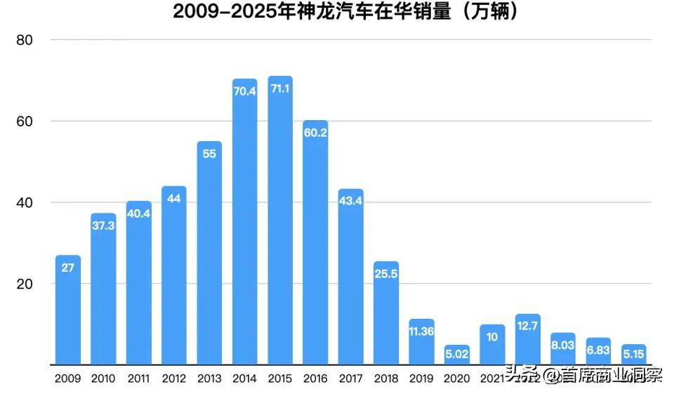 在2015年创造了年销超71万辆的巅峰成绩之后,神龙开始肉眼可见的迅速下落。